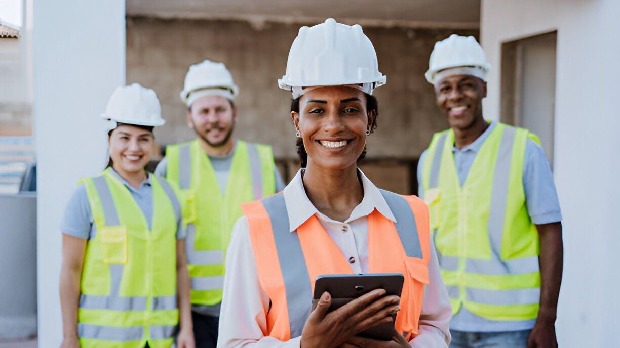 ➤ Rompi berwarna terang dengan strip reflektif meningkatkan visibilitas safety officer di lapangan, terutama saat malam atau kondisi asap tebal. Topi safety tetap wajib dibawa saat memasuki area proyek.